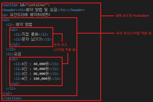 μμ μ νμλ μμ μμμ μ€νμΌμ μ μ©νλ μ νμλ‘ λ μμ μ¬μ΄μ '>'λ₯Ό νμν΄ λΆλͺ¨ μμμ μμ μμλ₯Ό ꡬλΆνλ€.