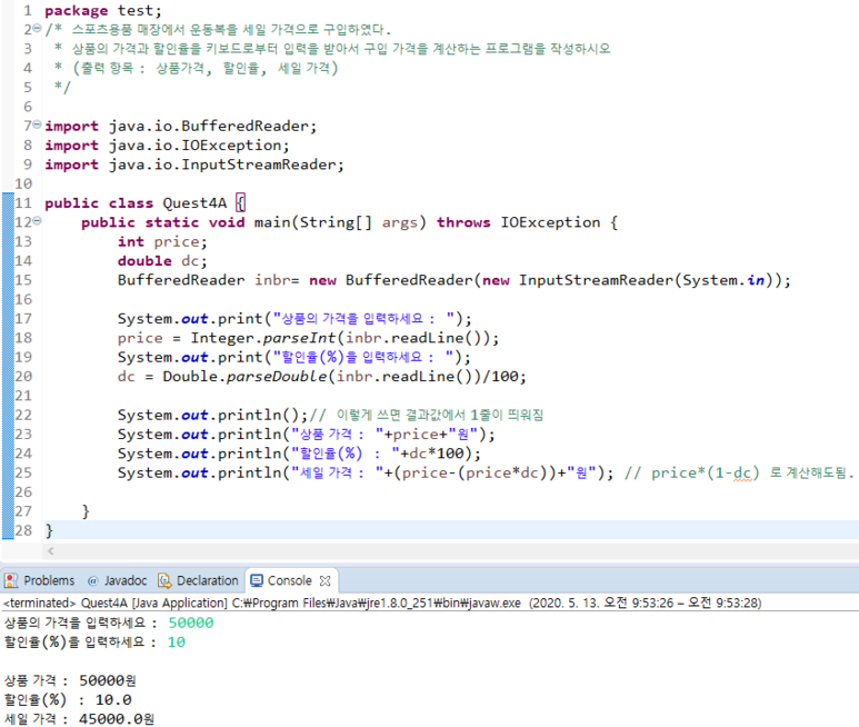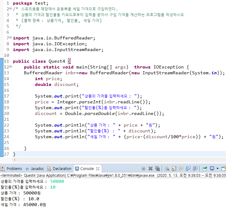 ์ค์ต 1) ์คํฌ์ธ ์ฉํ ๋งค์ฅ์์ ์ด๋๋ณต์ ์ธ์ผ ๊ฐ๊ฒฉ์ผ๋ก ๊ตฌ์ ํ์๋ค. ์ํ์ ๊ฐ๊ฒฉ๊ณผ ํ ์ธ์จ์ ์ ๋ ฅ์ ๋ฐ์์ ๊ตฌ์ ๊ฐ๊ฒฉ์ ๊ณ์ฐํ๋ ํ๋ก๊ทธ๋จ์ ์์ฑํ์์ค.