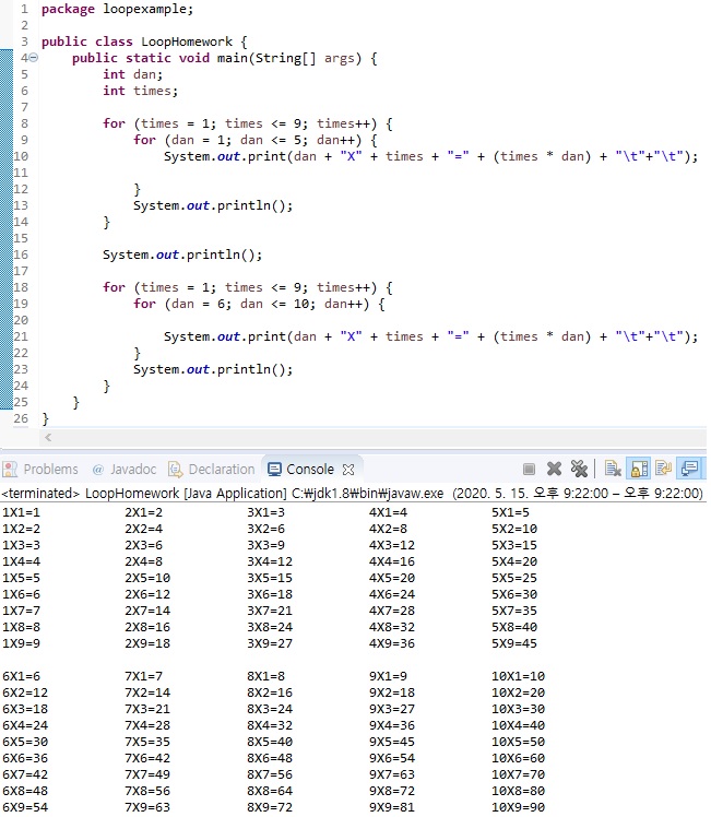 -for문 3줄로만 만들어라함. 마지막 3번째 for문에선 초기화값이 2개고 -+*/을 써서 식을 만들라함