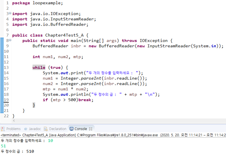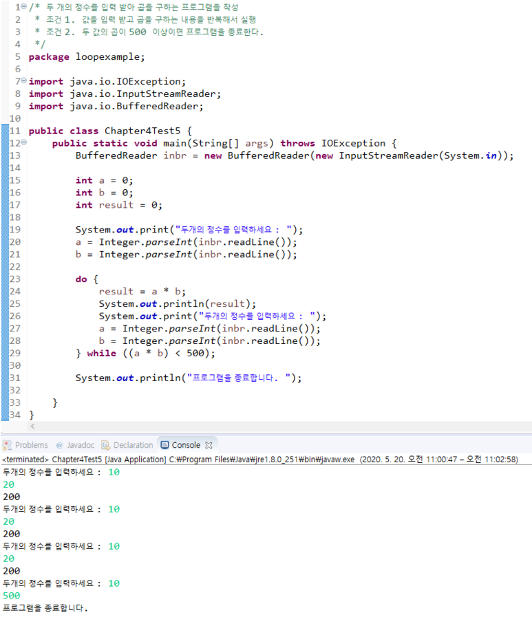 쑰건 2. λ κ°μ κ³±μ΄ 500 μ΄μμ΄λ©΄ νλ‘κ·Έλ¨μ μ’ λ£νλ€.