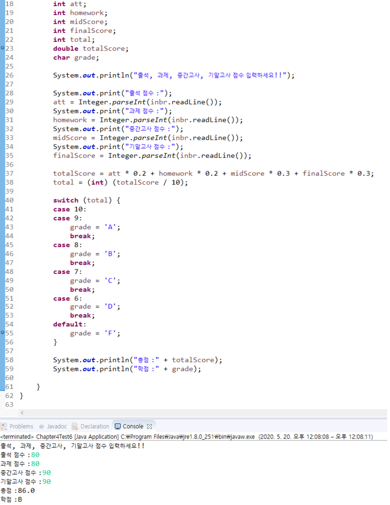 쑰건 3. νμ :90~100:A, 80~89:B, 70~79:C, 60~69:D, λλ¨Έμ§ F (쑰건 3μ switchλ¬Έ μ¬μ©)