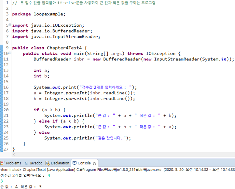 μ¬νλ¬Έμ 2) λ μ μλ₯Ό μ λ ₯ λ°μ if-elseλ¬Έμ μ¬μ©νμ¬ ν° κ°κ³Ό μμ κ°μ ꡬνλ νλ‘κ·Έλ¨μ λ§λμμ€.