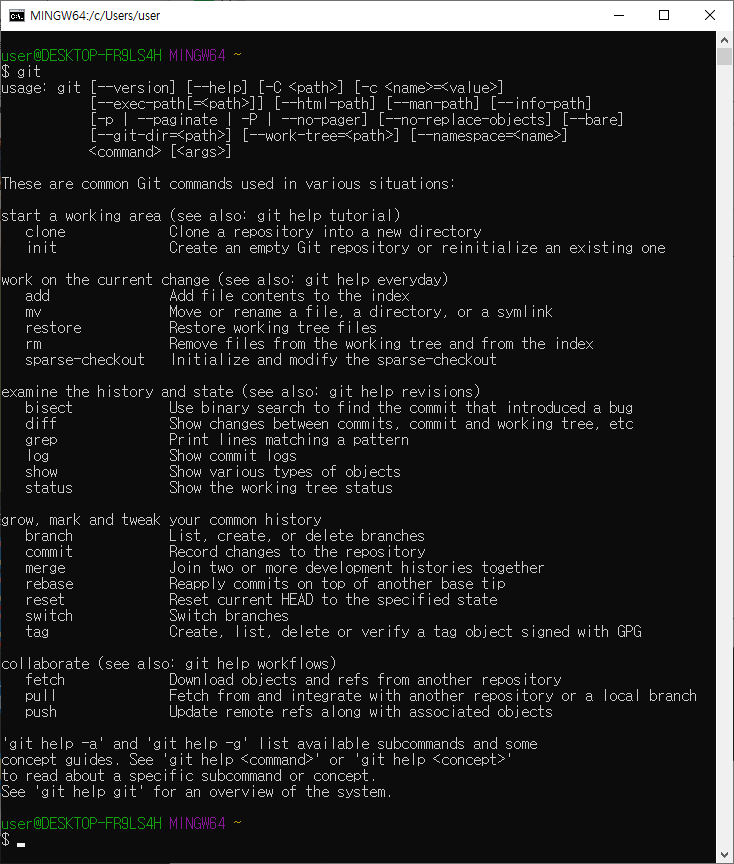 4. Git Bash๋ฅผ ํด๋ฆญํด์ ์ฐฝ์ด ์ด๋ฆฌ๋ฉด 'git'์ด๋ผ๊ณ ์ ๋ ฅ ํ enter์ ๋๋ฌ๋ณธ๋ค. ์ฌ๋ฌ๊ฐ์ง ์ต์ ์ด ํ์๋๋ค๋ฉด ์ ๋๋ก ์ค์น๋๋ ๊ฒ์ด๋ค.