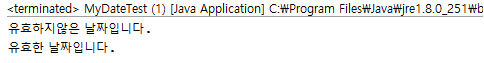 - day, month, year ๋ณ์๋ private์ผ๋ก ์ ์ธํ๋ค - ๊ฐ ๋ณ์์ get, set ๋ฉ์๋๋ฅผ public์ผ๋ก ๋ง๋ ๋ค - MyDate(int day, int month, int year) ์์ฑ์๋ฅผ ๋ง๋ ๋ค - public boolean isValid( ) ๋ฉ์๋๋ฅผ ๋ง๋ค์ด ๋ ์ง๊ฐ ์ ํจํ์ง ํ์ธ - MyDateTest ํด๋์ค์์ ์์ฑํ MyDate ๋ ์ง๊ฐ ์ ํจํ์ง ํ์ธํ๋ค |