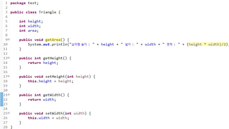 -private์ผ๋ก ํ ๊ฒ -getter, setter ์ฌ์ฉํ ๊ฒ -getArea( ) ์ ์ฌ์ฉํด ์ถ๋ ฅํ ๊ฒ |