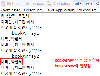 System.out.println("=== bookArray2 ==="); // bookArray2 ๋ฐฐ์ด ์์ ๊ฐ๊ณผ ๋ค๋ฅธ ๋ด์ฉ์ด ์ถ๋ ฅ๋จ