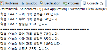 System.out.println("ํ์ " + studentName + "์ ์ด์ ์ " + total + " ์
