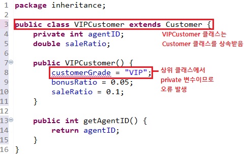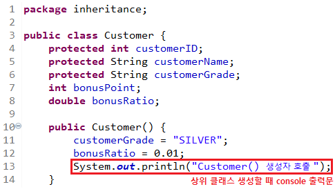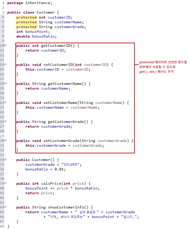 customerKim.setCustomerID(10020); // customerID๋ protected ๋ณ์์ด๋ฏ๋ก set() ๋ฉ์๋ ํธ์ถ