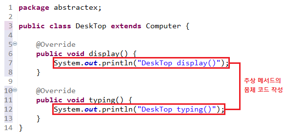 -4~12ํ์ ์์ ํด๋์ค์ธ Computer ํด๋์ค์ ํฌํจ๋ ์ถ์ ๋ฉ์๋์ธ display()์ typing()์ ์ฌ์ ์ํ๋ ๋ถ๋ถ์ด๋ค. ์ด ๋ชธ์ฒด ๋ถ๋ถ์ ์ํ๋ ์ฝ๋๋ฅผ ๊ตฌํํ๋ฉด ๋๋ค.