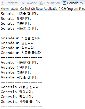 Q5) Car ์ถ์ ํด๋์ค๋ฅผ ์์๋ฐ๋ Sonata, Avante, Grandeur, Genesis ํด๋์ค๊ฐ ์๋ค. ๊ฐ ์ฐจ๋ ์ฃผํํ๊ธฐ ์ํด ๋ค์ ์์๋ก ์์ง์ธ๋ค.
