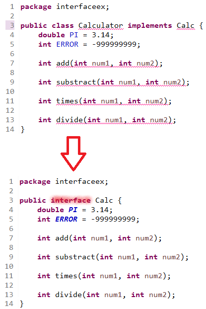 μΈν°νμ΄μ€λ₯Ό ꡬνν ν΄λμ€κ° μμ λ κ·Έ ν΄λμ€λ ν΄λΉ μΈν°νμ΄μ€νμΌλ‘ 묡μμ ν λ³νμ΄ μ΄λ£¨μ΄μ§λ©°, ν λ³νλμμ λ μ¬μ©ν μ μλ λ©μλλ μΈν°νμ΄μ€μμ μ μΈν λ©μλλΏμ΄λ€.
