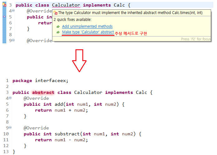 Calculator ν΄λμ€λ μΈν°νμ΄μ€μμ μ μΈν μΆμ λ©μλ μ€ μΌλΆ λ©μλλ§ κ΅¬ννμΌλ―λ‘ μΆμ ν΄λμ€μ΄λ€.