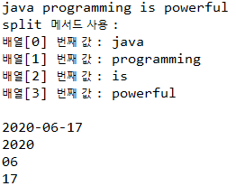 System.out.println("split ๋ฉ์๋ ์ฌ์ฉ : ");