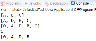 myList.add(1, "D"); // LinkedList์ ์ฒซ ๋ฒ์งธ ์์น์ D ์ถ๊ฐ