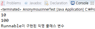 -μ§μ λ΄λΆ ν΄λμ€ MyRunnableμ μ μΈνμ§λ§, μ΄ ν΄λμ€ μ΄λ¦μ μ¬μ©νλ κ³³μ 맨 λ§μ§λ§μ ν΄λμ€λ₯Ό μμ±νμ¬ λ°νν λ λΏμ΄λ€. κ·Έλμ λ€μ μμ μ²λΌ μ΄λ¦μ μλ΅ν Runnable μΈν°νμ΄μ€λ₯Ό λ°λ‘ μμ±ν΄μ λ°ννλ μ΅λͺ ν΄λμ€ νμμΌλ‘ μλ‘κ² μ μΈνλ€.