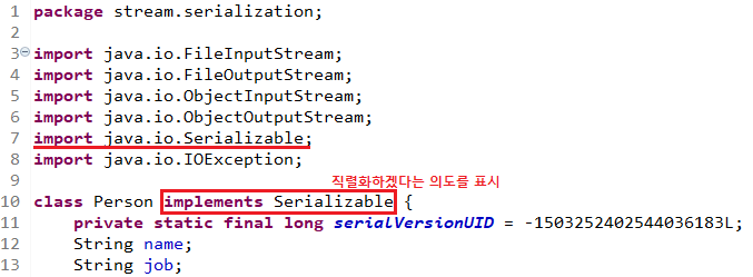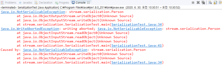 ์ ํ๋ก๊ทธ๋จ์ ์คํํ๋ฉด ์ถ๋ ฅํ๋ฉด์ฒ๋ผ ์ค๋ฅ๊ฐ ๋ฐ์ํ๋ค. ์ง๋ ฌํ๋ ์ธ์คํด์ค ๋ด์ฉ์ด ์ธ๋ถ๋ก ์ ์ถ๋๋ ๊ฒ์ด๋ฏ๋ก ํ๋ก๊ทธ๋๋จธ๊ฐ ์ง๋ ฌํ๋ฅผ ํ๊ฒ ๋ค๋ ์๋๋ฅผ ํ์ํด์ผ ํ๋ค. ๋ฐ๋ผ์ Person ํด๋์ค์ ๋ง์ปค ์ธํฐํ์ด์ค์ธ Serializable ์ธํฐํ์ด์ค๋ฅผ ๋ค์๊ณผ ๊ฐ์ด ์ถ๊ฐํ๋ค.