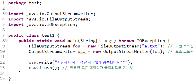 OutputStreamWriter osw = new OutputStreamWriter(fos); // ๋ณด์กฐ ์คํธ๋ฆผ