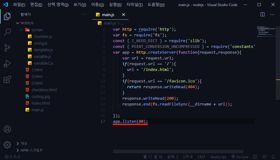 ๋ง์ผ port ๋ฒํธ๋ฅผ 80 ์ผ๋ก ๋ฐ๊พธ๊ณ ๋ค์ ํฐ๋ฏธ๋์ node main.js๋ฅผ ์คํ์ํค๋ฉด
