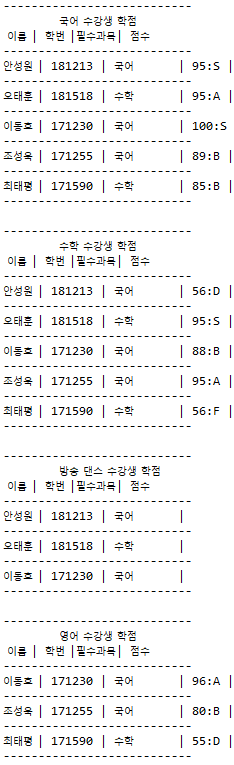 getScoreGrade(student, subject); // ํ์๋ณ ์๊ฐ ๊ณผ๋ชฉ ํ์ ๊ณ์ฐ