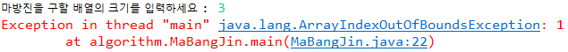 System.out.println("๋ง๋ฐฉ์ง์ ๊ตฌํ ๋ฐฐ์ด์ ํฌ๊ธฐ๋ฅผ ์