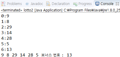 System.out.println(i + ":" + lotto[i]); // ์ธ๋ฑ์ค ์์น์ ๋๋ค๊ฐ ํ์ธ
