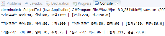 System.out.println("*기본교과* 국어:" + kor + ", 영어:" + eng + ", 수학:" + math + " | [합계:" + sum + ", 평균:" + avg + "]");
