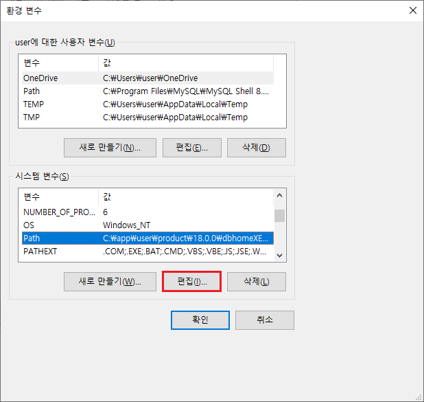 4. '์๋ก ๋ง๋ค๊ธฐ'๋ฅผ ํด๋ฆญํด์ C:\Program Files\MySQL\MySQL Server 8.0\bin ์ ์ถ๊ฐํ๊ณ ํ์ธ์ ๋๋ฅธ๋ค.