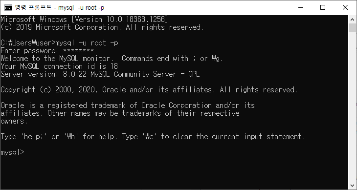 5. ํ๊ฒฝ๋ณ์ ์ค์ ํ ๋ช ๋ นํ๋กฌํํธ ์คํ์ ํด์ MySQL์ด ์คํ๋๋์ง ํ์ธํ๋ค.