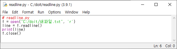 f.open("์ํ์ผ.txt", 'r')๋ก ํ์ผ์ ์ฝ๊ธฐ ๋ชจ๋๋ก ์ฐ ํ