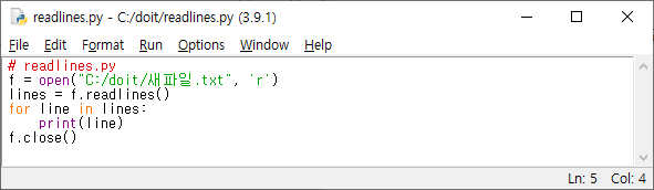 readlines ํจ์๋ ํ์ผ์ ๋ชจ๋ ์ค์ ์ฝ์ด์ ๊ฐ๊ฐ์ ์ค์ ์์๋ก ๊ฐ๋ ๋ฆฌ์คํธ๋ก ๋๋ ค์ค๋ค.