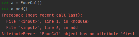 a = FourCal()μ μνν λ μμ±μ __init__μ΄ νΈμΆλμ΄ μμ κ°μ μ€λ₯κ° λ°μνλ€. μ€λ₯κ° λ°μν μ΄μ λ μμ±μμ λ§€κ°λ³μ firstμ secondμ ν΄λΉνλ κ°μ΄ μ λ¬λμ§ μμκΈ° λλ¬Έμ΄λ€.