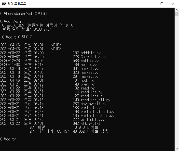 ๋จผ์ ๋ช ๋ น ํ๋กฌํํธ ์ฐฝ์ ์ด๊ณ mod1.py๋ฅผ ์ ์ฅํ ๋๋ ํ ๋ฆฌ๋ก ์ด๋ํ๋ค.