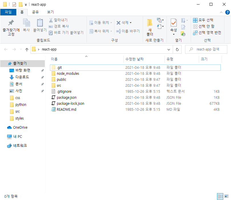 4. ์ค์น๊ฐ ์๋ฃ๋๋ฉด react-app ํด๋ ์์ ํ์ผ๋ค์ด ์์ฑ๋ ๊ฒ์ ํ์ธํ ์ ์๋ค.