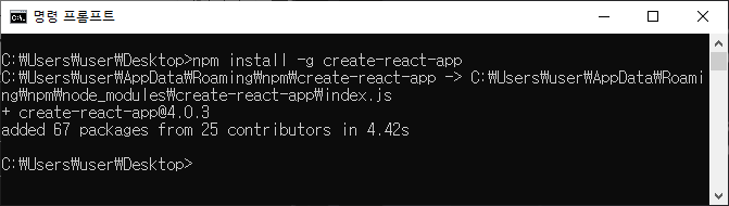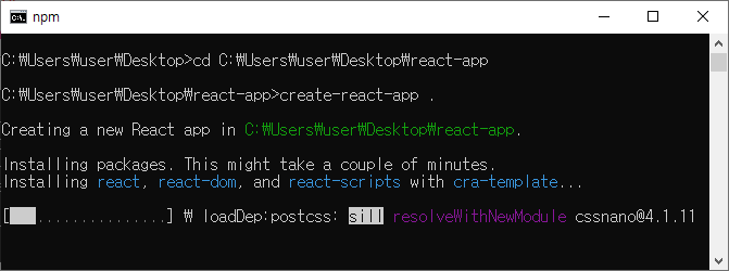 3. cmd ์ฐฝ์ ๋์ฐ๊ณ ๊ฒฝ๋ก๋ฅผ react-app ํด๋๋ก ์ค์ ํ๋ค. ๊ทธ๋ฆฌ๊ณ ๋ค์๊ณผ ๊ฐ์ด ๋ช ๋ น์ด๋ฅผ ์ ๋ ฅํ๋ค.