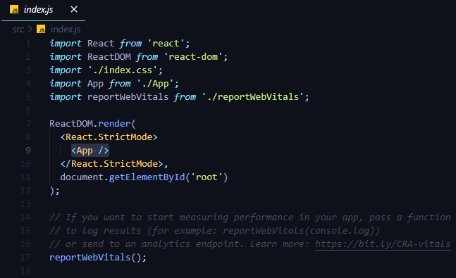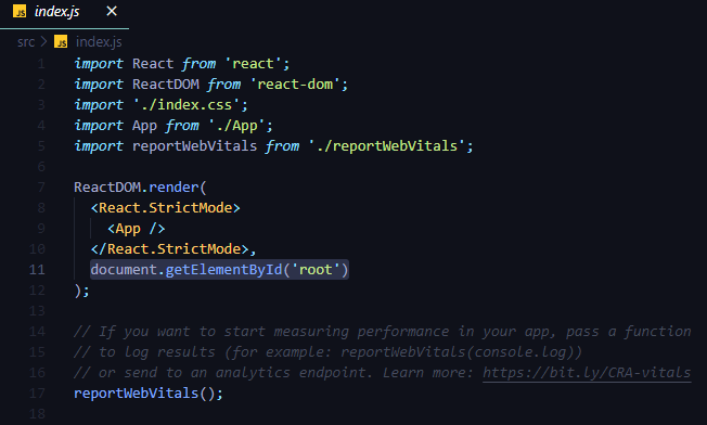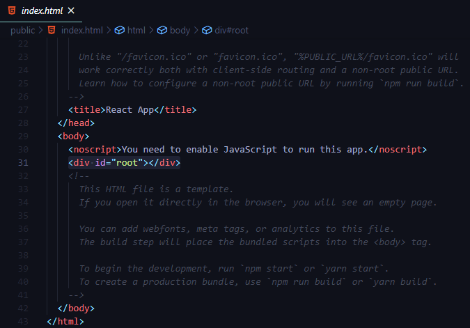 index.html ์์ id๊ฐ root์ธ ๊ณณ ํ๊ทธ ์์ชฝ์ ์ปดํฌ๋ํธ๊ฐ ๋ค์ด๊ฐ๋๋ก create-react-app์ ์ฝ์ํ์.