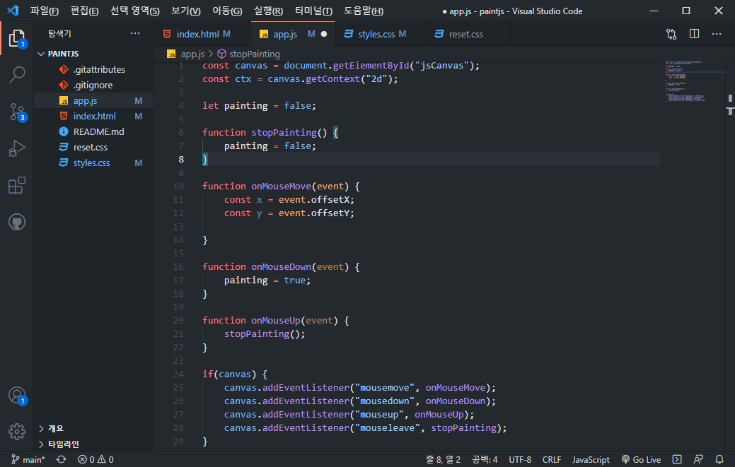 startPainting์ด๋ผ๋ ํจ์๋ฅผ ๋ง๋ ๋ค.