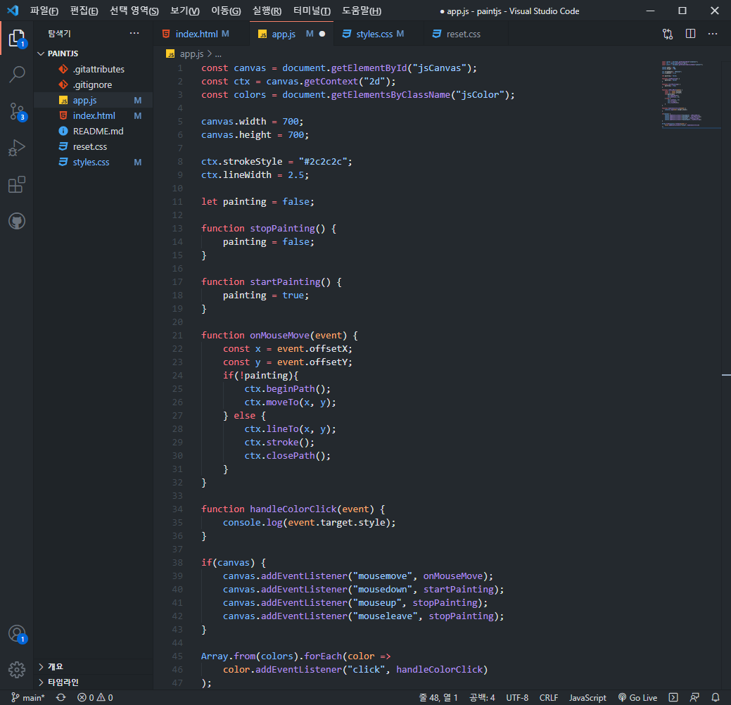 ์ฐ๋ฆฌ๊ฐ ํ๊ฑด ctx.strokeStyle์ ๋ฐ๊พผ ๊ฒ ๋ฐ์ ์๋ค.