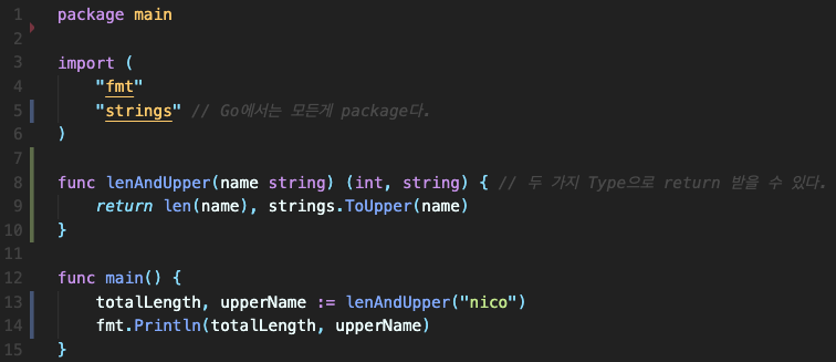 func lenAndUpper(name string) (int, string) { // ๋ ๊ฐ์ง Type์ผ๋ก return ๋ฐ์ ์ ์๋ค.