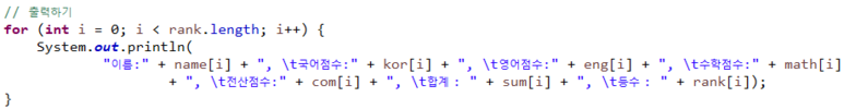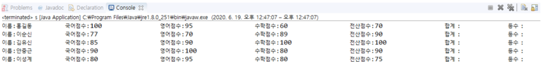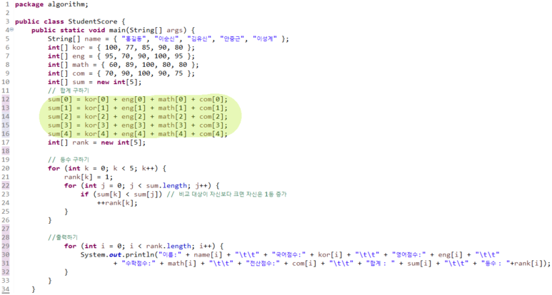 <쑰건> 1. νμμ μ΄μ μ΄ λμ μμΌλ‘ μμ°¨λ₯Ό λΆμ¬νλ€. 2. μκ³ λ¦¬μ¦μ μ¬μ©λ λ³μλ μλμ κ°λ€. name : μ΄λ¦. Stringν kor, eng, math, com : κ΅μ΄,μμ΄,μν,μ μ°μ μ. intν sum : ν©κ³. intν rank : μμ°¨. intν i,j,k : forλ¬Έ μ λ³μ |